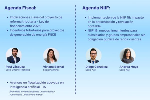 09Oct 2025 by planningweb No Comments Claves para entender la reforma tributaria y los nuevos estándares NIIF 18 y 19 Jueves 23 de octubre de 2025 Invitan Agenda Especialistas Información Separa AQUÍ Cargando…